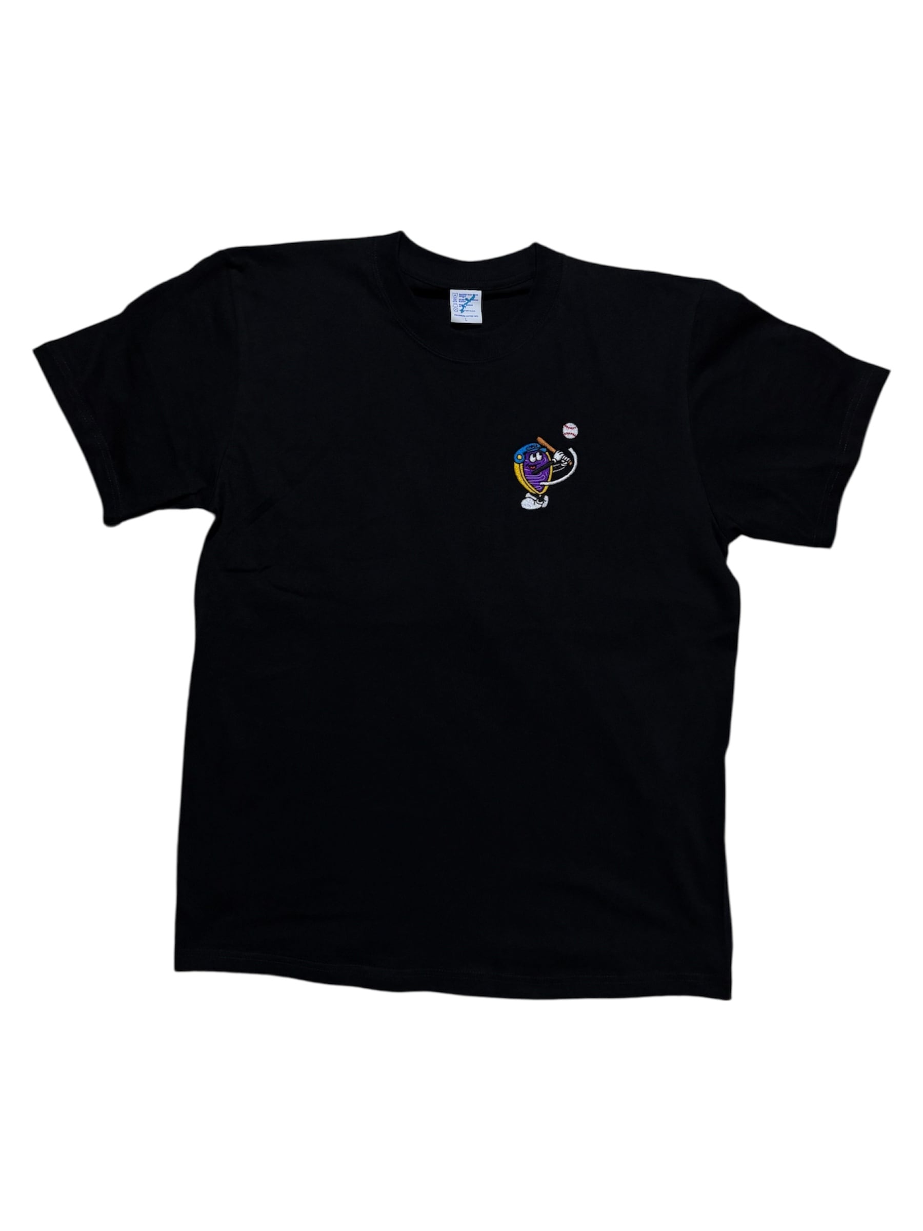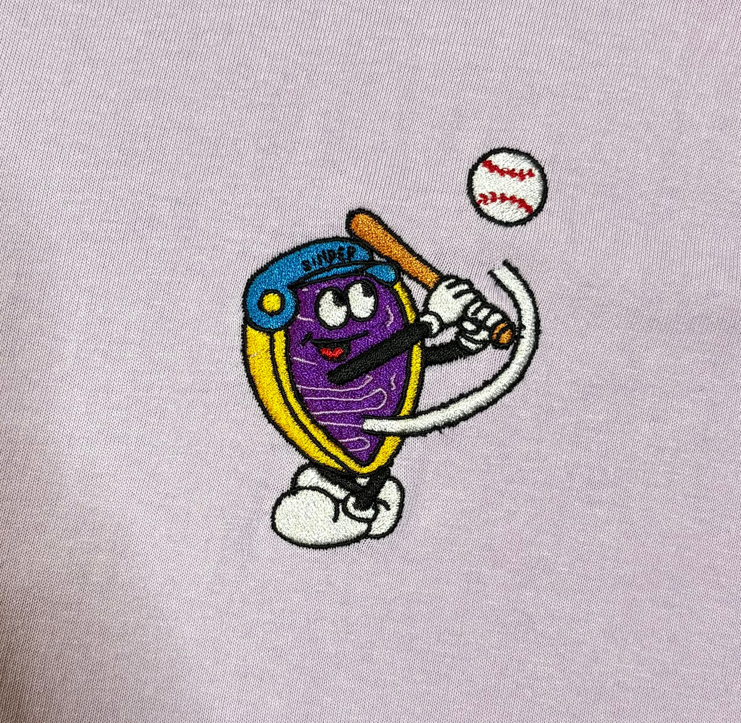 沖縄名物の紅芋タルトのキャラクターが沖縄で大人気の野球を可愛くカッコよく刺繍にて仕上げています。ワンポイントのロゴなので、シンプルで合わせやすいデザイン。