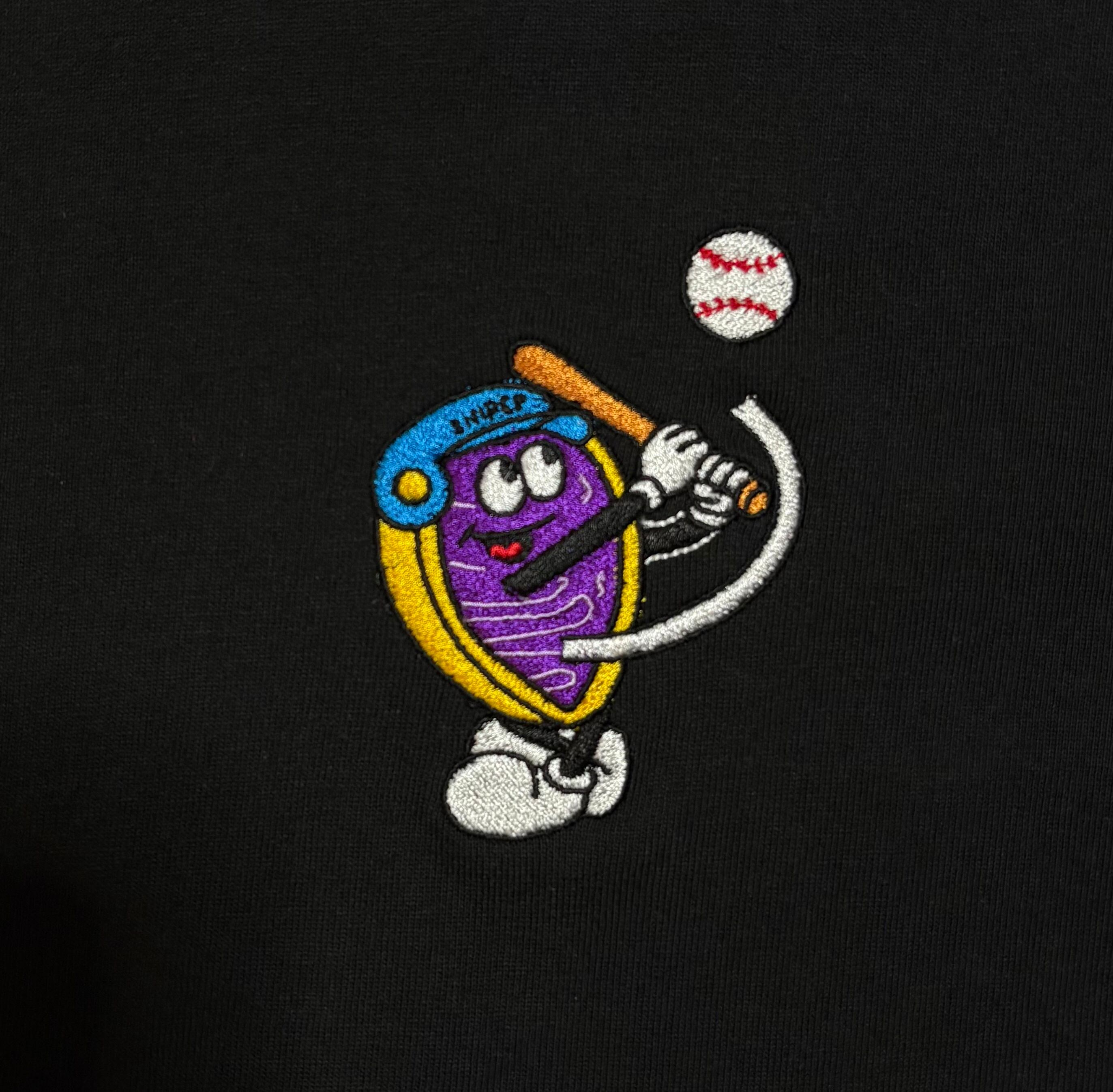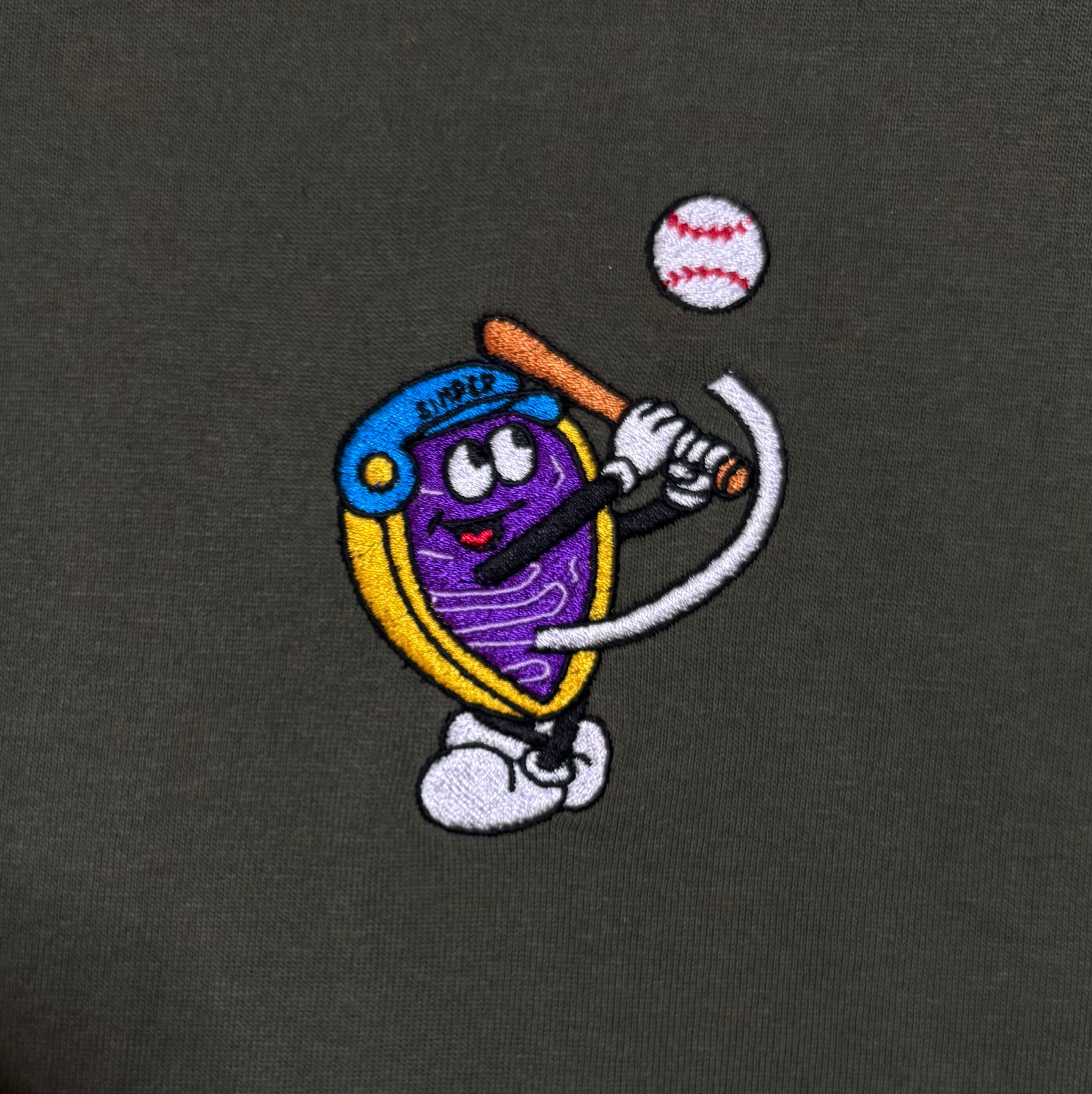 沖縄名物の紅芋タルトのキャラクターが沖縄で大人気の野球を可愛くカッコよく刺繍にて仕上げています。ワンポイントのロゴなので、シンプルで合わせやすいデザイン。
