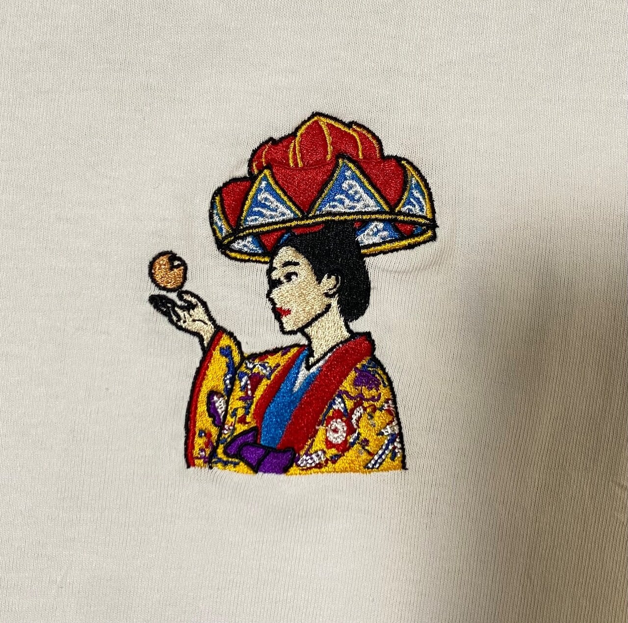 沖縄の伝統芸能『琉球舞踊』の女性を可愛くカッコよく刺繍にて仕上げています。